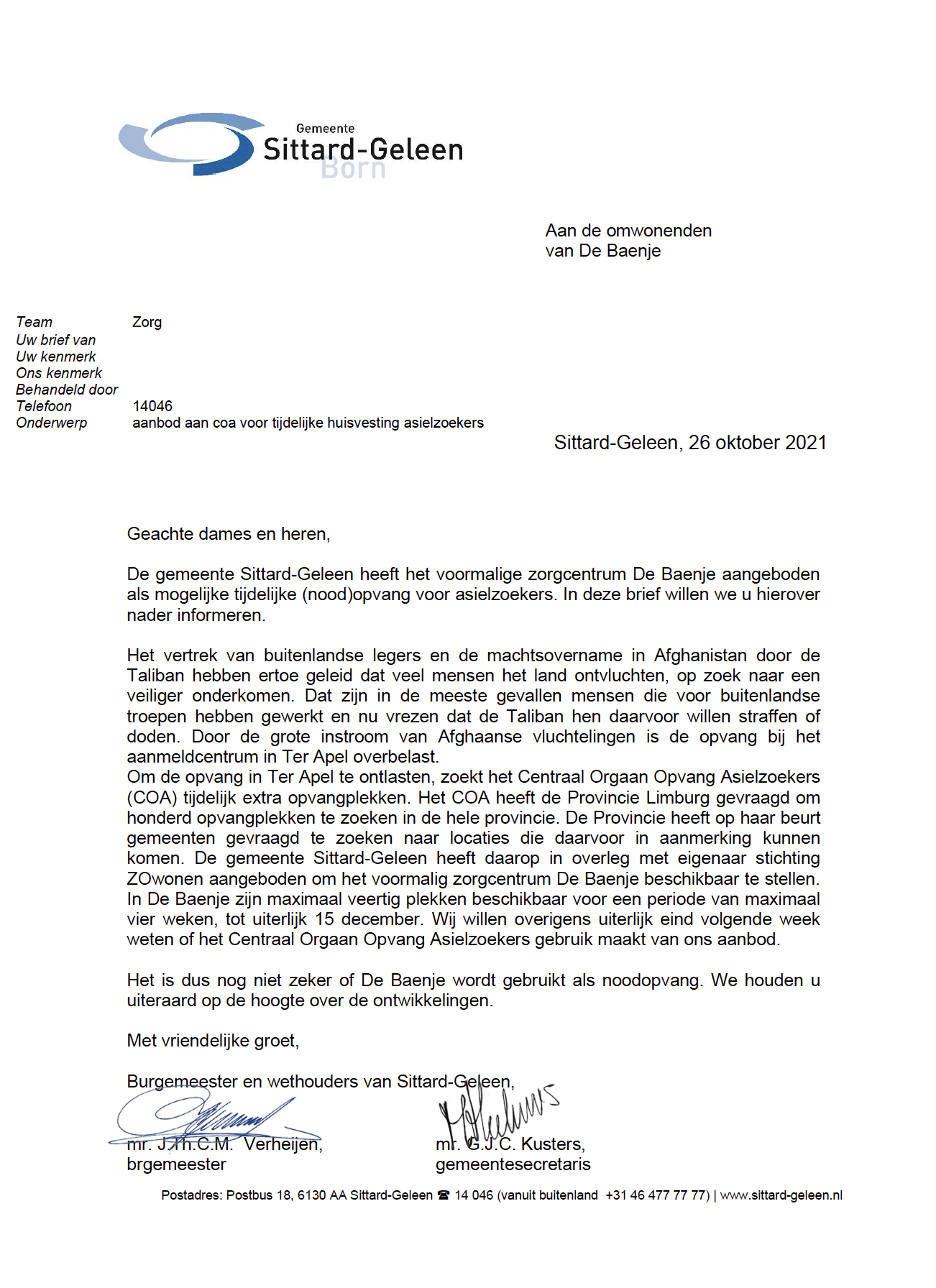 De gemeente Sittard-Geleen stelt tijdelijk veertig plekken beschikbaar als opvang voor asielzoekers. Als opvanglocatie is gekozen voor het leegstaand zorgcomplex De Baenje aan de Schuttestraat. Deze opvangplaatsen worden tot uiterlijk 15 december 2021 beschikbaar gesteld. Het pand wordt nu in gereedheid gebracht om 40 mensen tijdelijk te huisvesten. Het COA heeft iedere provincie gevraagd een honderdtal plekken beschikbaar te stellen. De gemeente Sittard-Geleen heeft bij alle omwonenden van De Baenje een brief bezorgd. Die brief kunt u hier lezen.